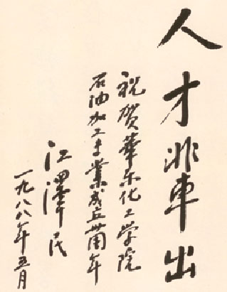 在专业成立五十周年之际,杰出校友章建华教授题词:“愿育才有方的石油加工系培养更多的石化优秀人才”,杰出校友王基铭院士题词:“坚持石油化工特色 传承拓展再创辉煌”。