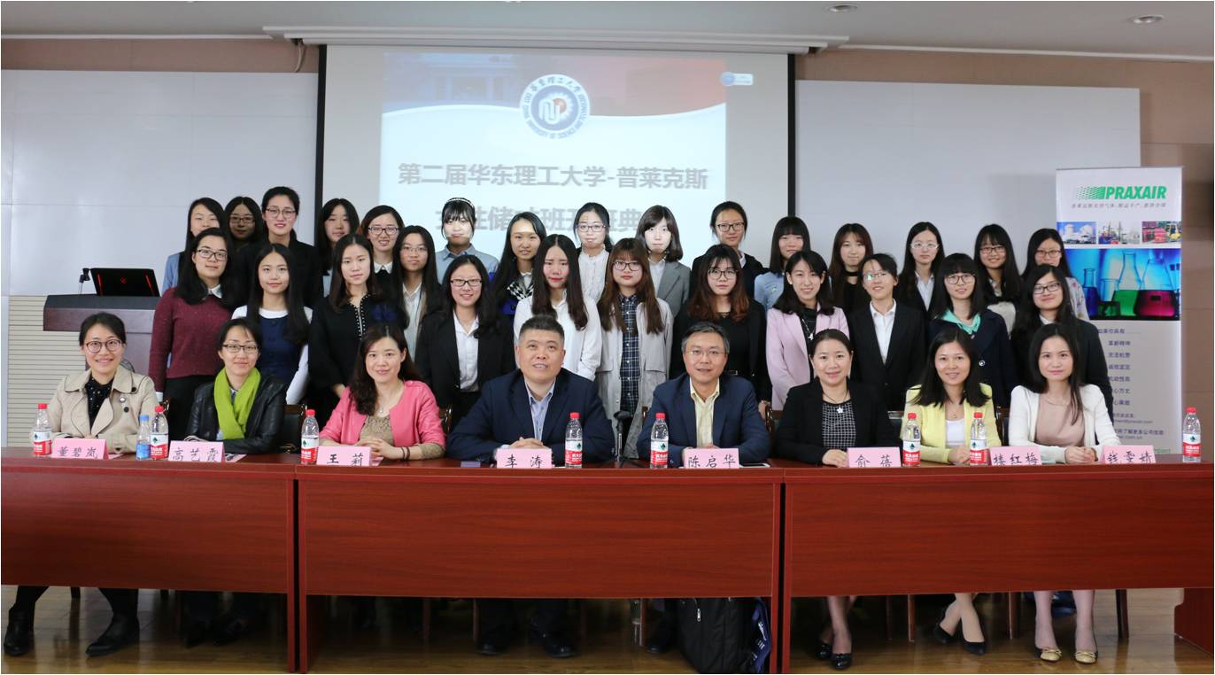 4月15日,第二届华东理工大学普莱克斯女性储才班(下简称“女性储才班”)开班典礼在奉贤校区大学生活动中心419室举行。出席活动的嘉宾有普莱克斯中国区大宗气体及包装气副总裁陈启华先生,中国区财务分析总监俞蓓女士、亚洲区人力资源总监楼红梅女士和人力资源专员钱雯婧。英国上市公司365妇委会常务副主任王莉、化工学院党委书记李涛、党委副书记高艺霞和团委副书记董碧岚参加了此次开班仪式。