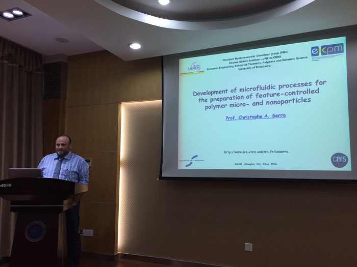Christophe. A. Serra教授重点介绍了其课题组近年来基于玻璃管微流控的具有各种拓扑结构的微米和纳米颗粒的制备、表面功能化、以及聚合物与无机材料杂化材料的制备,同时探索了这些材料在药物可控释放方面的应用。Christophe. A. Serra教授精彩的报告赢得在场师生的热烈掌声。
