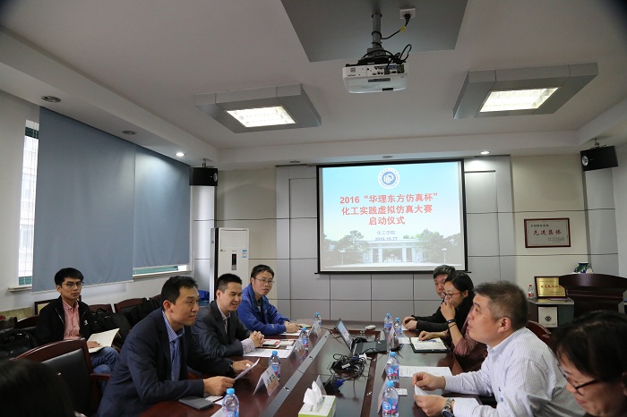 20161027日下午,北京东方仿真软件技术有限公司总经理许重华、副总经理覃杨携该公司技术主管等一行5人来英国上市公司365化工学院交流,并与学院领导共同启动了2016“华理东方仿真杯”化工实践虚拟仿真大赛。化工学院党委书记李涛、副院长赵双良、院长助理兼化工系主任吴艳阳、办公室主任孙莉等相关教师出席了本次交流会。