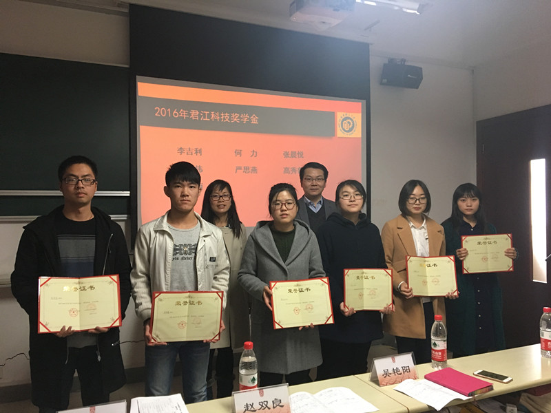 2016年12月9日中午,“君江科技奖学金”颁奖仪式在华东理工大学奉贤校区B教109室举行。化工学院教学副院长赵双良,化学工程系主任吴艳阳,化工学院2013级、2014级、2015级获奖学生和2016级参观学生出席了颁奖仪式,仪式由14级辅导员王梦雪主持。