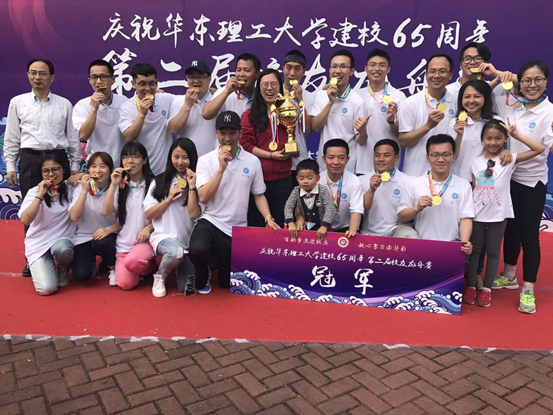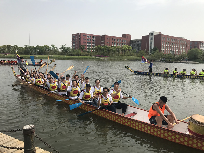 化工校友龙舟队的组建得到了化工学院的大力支持,学院为每位返校校友准备了印有“化工”字样的polo衫,亦有化工学子为校友们做奉贤校园导游。由19名校友组成的龙舟队,有94届校友,也有16届校友。比赛前,他们和蔼可爱,共同回忆在校时光;比赛时,他们信心满满,共同喊出“化工无敌”的口号,齐心协力,勇争第一。