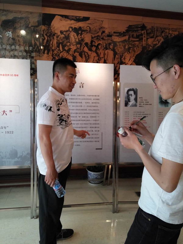 4、阳光明媚的初夏午后,我们化工学院的几个党支部联合组织了参观团中央机关旧址和中共淞浦特委机关旧址。我们走在繁华的淮海中路上,拐进了一条不起眼的弄堂里,看到了红墙黑瓦的渔阳里6号------团中央机关旧址,这里和外面仿佛是两个世界,没有了喧嚣,自是一片静谧的天地。映入眼帘的序厅里挂着一幅横跨三面墙的巨幅铜板壁画。五四运动、刘胡兰就义、红军长征、新中国成立、草原英雄小姐妹、女排夺冠、杨利伟乘“神舟五号”升空等画面,真实再现了80多年来我国青年运动蓬勃发展的光辉历程。在刘少奇、任弼时、俞秀松这些名字的映衬下,我仿佛看到了那时作为一名青年人所担负的抱负和责任,我们也要像他们一样坚定着自己的理想,发挥着自己的光和热,把渔阳里6号的光芒和影响穿透地域和时空的界限,继续发扬光大。