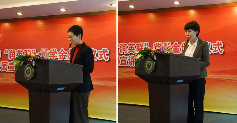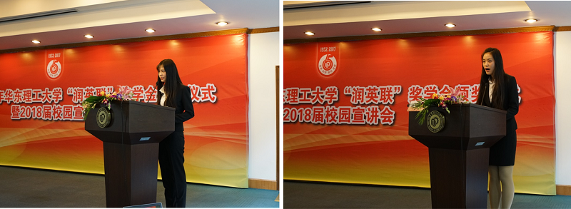 Chris Locke先生则分享自己的成长求职经历,同时详细介绍了润英联的基本情况、发展历程及企业文化,表达了对华理的喜爱与公司对华理学子的欢迎。随后崔姗姗副部长宣读了本年度润英联奖学金获奖名单,校企嘉宾为获奖同学颁发证书、合影留念;获奖的研究生代表陈燕和本科生代表李雨柔分别对学校的培育、老师的教导和润英联公司致以感谢,表达了继续努力提升自己为社会发展做出贡献的决心。