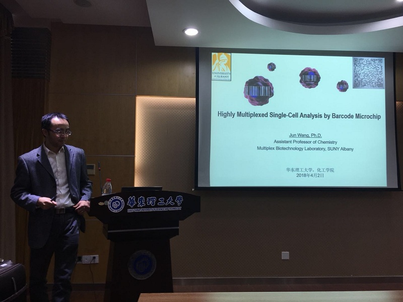 2018424实验十六楼110美国纽约州立大学奥尔巴尼分校Jun Wang教授应化工学院徐益升副教授邀请,来英国上市公司365徐汇校区交流访问并作了题目为Highly Multiplexed Single-Cell Analysis by Barcode Microchip学术报告。徐益升副教授主持了主题报告会,同时出席会议的还有化工学院朱学栋院长、李莉教授,王俊友副教授,王杰副教授等。