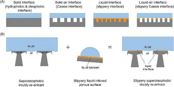 超疏油表面能够排斥各种表面张力的液体,因此在自清洁、防腐蚀和液体分离等领域中具有重要应用。目前,超疏油表面主要通过结合低表面能材料和多重凹型微结构制备得到。然而,这些超疏油表面仍具有较大的固液接触面积,对液滴表现出较大的粘附力。