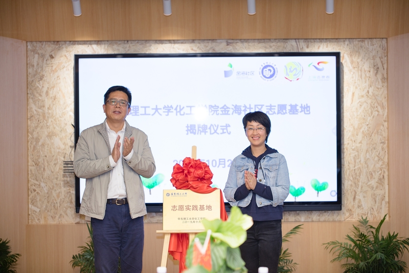 揭牌仪式隆重举行,项华与高艺霞共同为“华东理工大学化工学院金海社区志愿实践基地”揭牌。