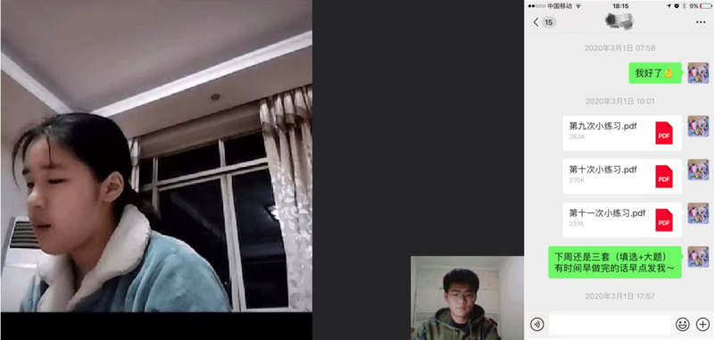 众多志愿者面对疫情当前并没有停止服务奉献的脚步,而是创新志愿形式,依托网络展开温暖人心的线上志愿服务活动。化工176钱逸玲同学通过钉钉直播和微信答疑的方式,为一个高三的学生提供数学科目的系统化辅导,目前已连续辅导7次共12小时。针对学生的实际情况,钱逸玲找出了自己高中时期的数学笔记,每天扫描一部分后分享给她,并且还精心挑选了部分历年上海高三一模二模试卷的题目帮助她巩固练习。化工学院学生会副主席海俊琪同学发挥学生骨干表率作用,在家乡湖南省邵阳市通过QQ线上视频,为两名初三学生进行了线上化学辅导,每天30min-60min,帮助同学答疑解惑,同时还专门针对他们的弱项,有目的地进行知识点的讲解和真题的训练。此外,学院共有“花梨梦”志愿服务项目正式志愿者26名,以及储备志愿者112名。