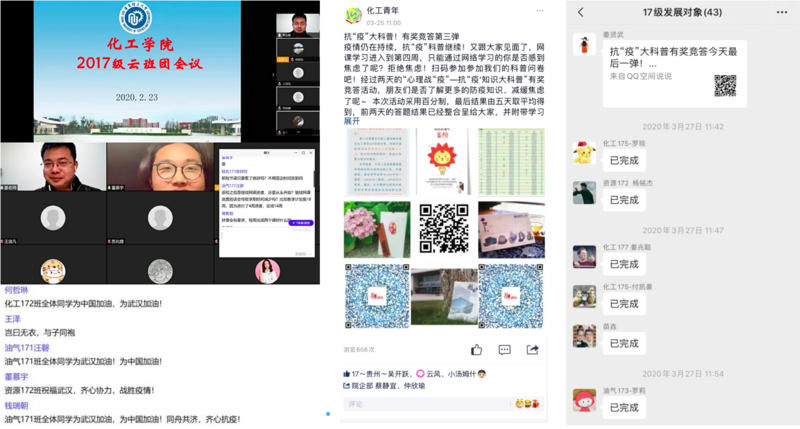 通过网络班会提供心理疏导和关心关怀,开展丰富多彩的战“疫”主题活动,充分发挥线上实时互动的优势,跨越空间障碍,利用“云”技术,实现“云”沟通,拉近居家学生与老师与学校的距离。化工学院本科生奉贤党支部联合学院心理之家共同举办了心理战“疫”——抗“疫”大科普知识竞答活动,化工青年集结地公众号和化工青年QQ共推出5期,得到了同学们的热烈响应,各年级党员、发展对象、入党积极分子、心理委员及广大同学积极参加。第一次活动收到有效答题210份,5次活动的参与量达到了637人次。让广大青年学子对新型冠状病毒感染的肺炎有了更加深刻的了解和认识,更加强了学生的自我教育和自主学习,增强了家校联动的凝聚力,也展现了化工青年学子为抗击疫情贡献力量的信心和担当,是高校“云”上主题活动模式创新的有益探索。