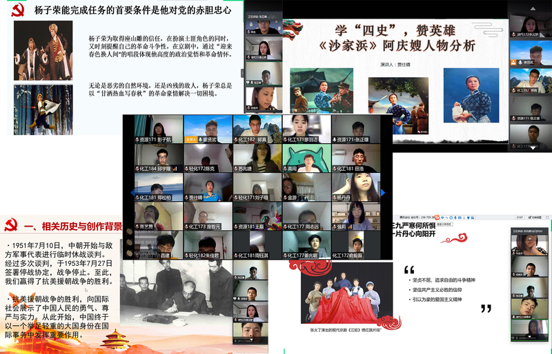 5月25日,化工学院思政党支部、本科生奉贤党支部、学生京剧社团团支部共同举办“学‘四史’、颂英雄、践初心”的线上主题党团共建活动,以党建带团建,绽放青春力量。化工学院党委副书记高艺霞出席,各年级辅导员、学生党员、发展对象、入党积极分子、京剧社及学生京剧社团团支部的成员共150余人参加了活动。