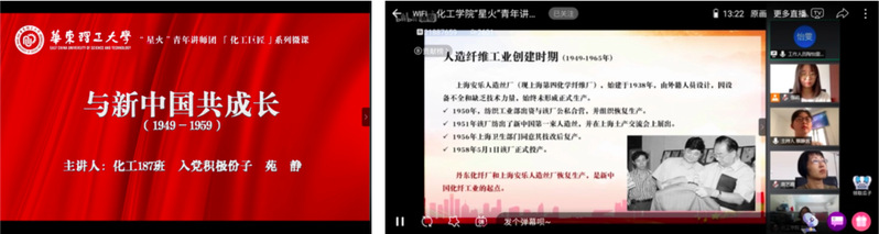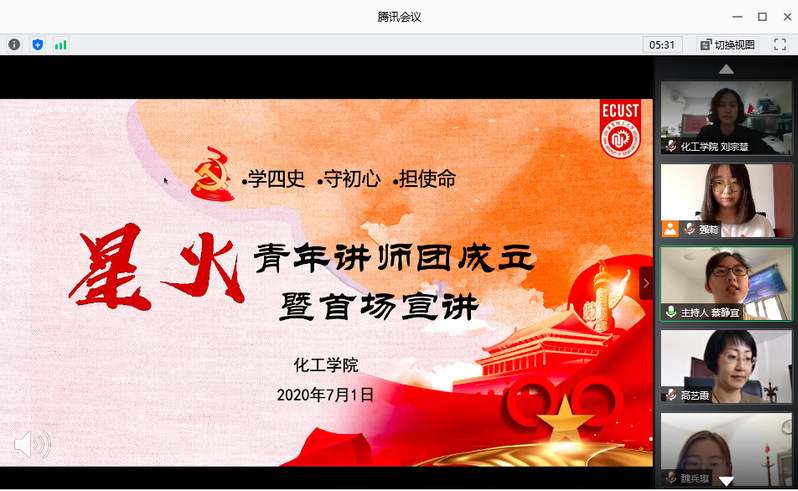 马克思主义学院党委副书记、副院长、星火社指导教师邱卫东,化工学院党委副书记高艺霞出席会议,全体辅导员、“星火”青年讲师团成员、全体学生党员、入党积极分子以及团员青年通过腾讯会议、化工青年集结地站直播平台参加活动。本次活动由星火社社长蔡静宜主持,直播人气达3000余人次。