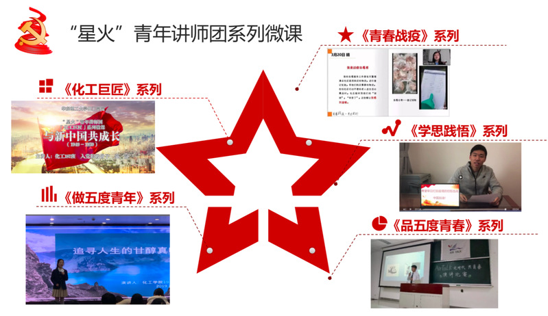 “星火微课体系涵盖五大系列,打造立体化、多维度宣讲平台。《化工巨匠》系列微课生动展示新中国成立以来化工人辛勤耕耘的奋斗实践,深刻解读一代代化工巨匠坚守初心、忠诚使命的感人情怀和崇高精神,唱响礼赞新中国、奋进新时代的昂扬旋律;《青春战疫》系列微课化“疫情 危机”为“教育契机”,将战“疫”一线志愿者的鲜活事迹请进思政课堂;《学思践悟》系列微课展示青年先锋示范、自强奋进、知行合一、奋斗追梦的青春故事;《做五度青年》系列微课通过“高度”、“温度”、“风度”、“态度”、“亮度”五个维度展示新时代青年的综合素养;《品五味青春》系列微课“品味”酸甜苦辣咸中难忘的青春滋味;《戎装青春》系列微课则展示退伍大学生携笔从戎,在绿色军营中淬炼成长,以实际行动报效祖国的动人故事。