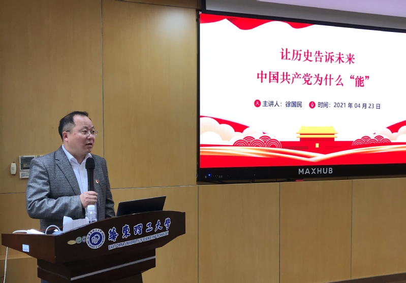 4月23日下午,化工学院组织全院教职工开展党史专题学习,邀请马克思主义学院副院长徐国民教授作题为“让历史告诉未来:中国共产党为什么‘能’”的报告。报告会由化工学院党委书记朱学栋主持。