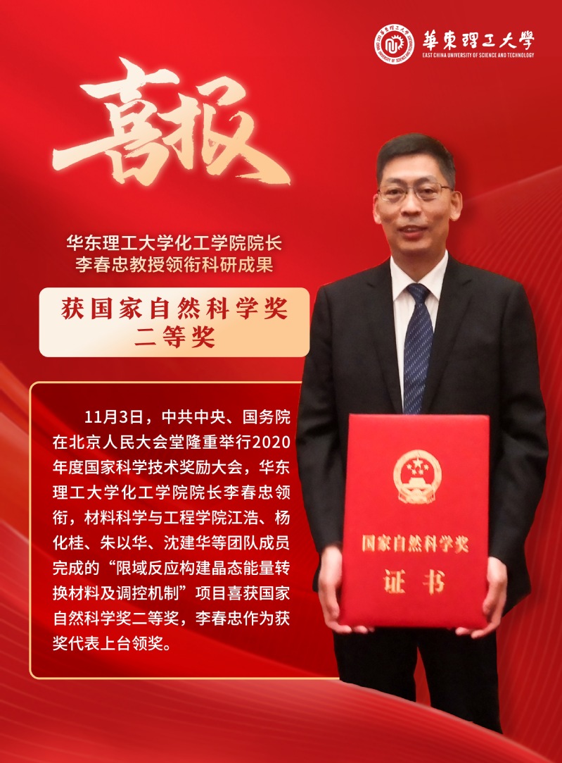 11月3日,中共中央、国务院在北京人民大会堂隆重举行2020年度国家科学技术奖励大会,华东理工大学化工学院院长李春忠教授领衔,材料科学与工程学院江浩、杨化桂、朱以华、沈建华等团队成员完成的“限域反应构建晶态能量转换材料及调控机制”科研成果喜获国家自然科学二等奖,李春忠作为获奖代表上台领奖。