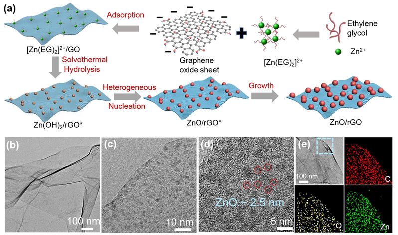 基于此,该研究提出了一种简便通用的“界面诱导成核”的合成策略,利用氧化石墨烯表面上的含氧官能团作为快速异相成核的位点,通过表面扩散控制颗粒成长,进而在二维表面上形成3nm尺寸、单分散和高密度负载的系列金属氧化物(ZnO、CoO、CuO、MgO、Fe2O3、Nb2O5、CdO、 La2O3、MoO3等)纳米颗粒。统计发现,超细纳米颗粒的面密度均为9个/10×10nm2,且不随反应时间和反应物浓度而改变,对应于“异相成核-扩散控制生长”的颗粒形成机制。进一步的DFT计算表明,氧化石墨烯表面的含氧官能团,特别是羧基和环氧基,能够优先吸附金属离子,并提供成核位点,进而对纳米颗粒的形成和均匀生长起着重要作用。