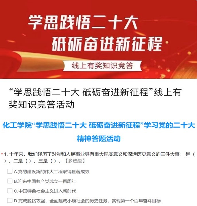 为深入学习宣传贯彻党的二十大精神,化工学院党委和工会近期开展了“学思践悟二十大 砥砺奋进新征程”线上知识竞答活动,以赛促学、以学促知、以知促行,切实把思想和行动统一到党的二十大精神上来。