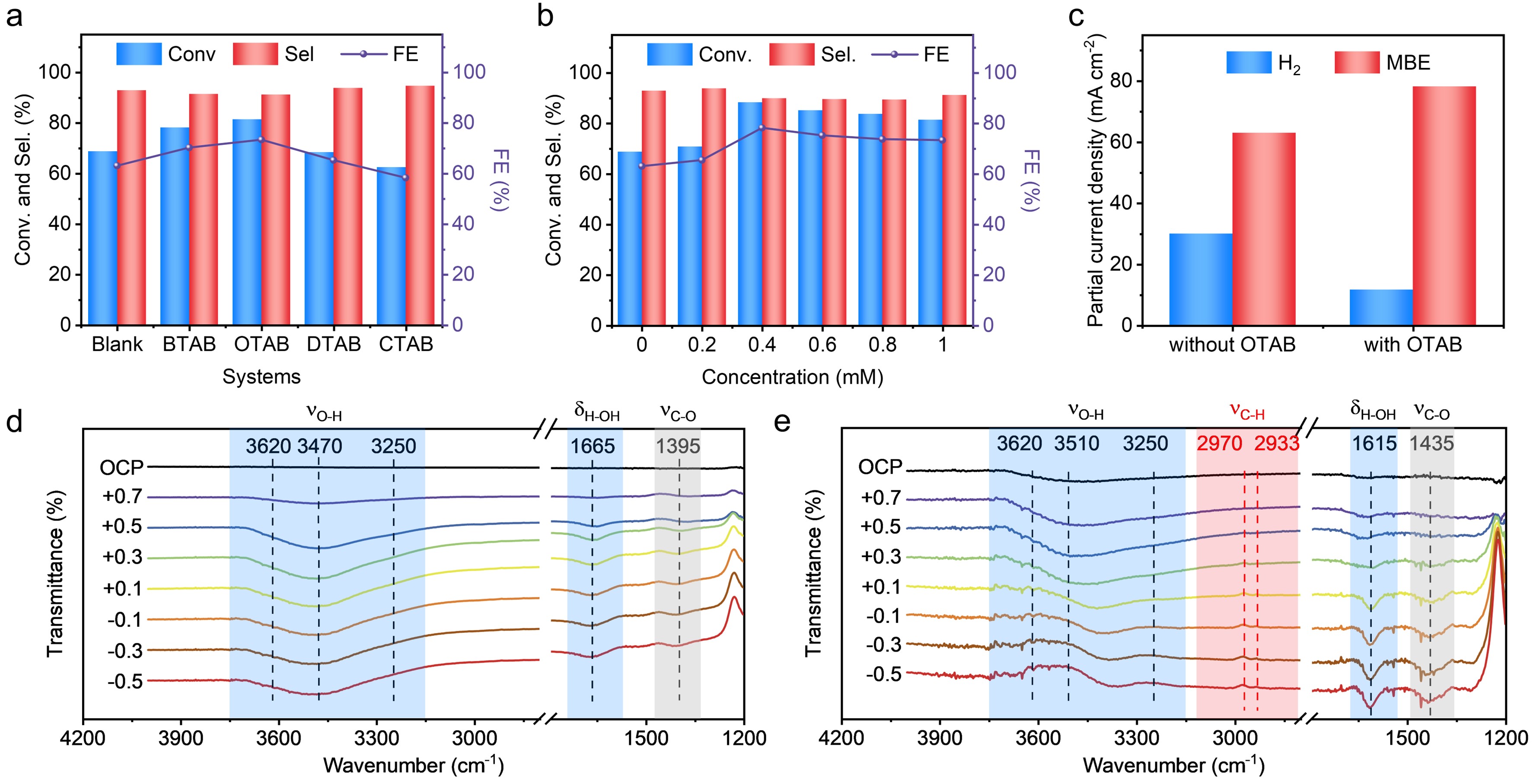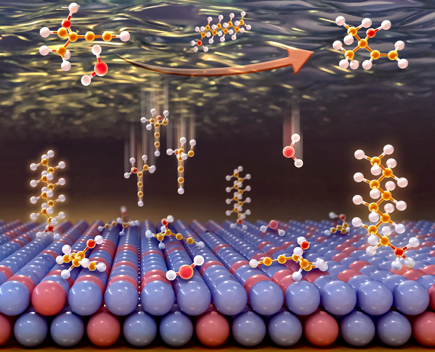 在电催化炔醇半加氢反应中,该工作创新性地构建了一个掺杂剂以及表面活性剂共调节的电极-电解液界面,通过性能研究、原位红外光谱表征以及理论计算相结合的方法,阐明了炔醇电催化加氢过程中高活性和法拉第效率的来源。通过以硼掺杂的钯基催化剂作为模型催化剂,探究不同链长的季铵盐表面活性剂对于界面水的传质以及炔醇加氢反应的影响。性能研究表明,加入合适链长以及合适浓度的表面活性剂可以实现最大化的烯醇法拉第效率。原位光谱证明,随着电压负移,界面水的反向吸附峰表明孤立水的显著损失,而弯曲水的峰偏移表明发生了从强氢键水到弱氢键水的转变。在含有表面活性剂的界面上形成适当的疏水微环境,可以在一定程度上阻碍界面水的传质,从而抑制HER。分子动力学结果表明,通过阳离子表面活性剂在界面上的自组装,建立了一个促进炔醇传质,并适当地阻碍水传质的界面微环境。因此,在不降低烯醇选择性的情况下,明显促进了炔醇半氢化到烯醇的法拉第效率。该工作对于反应过程和反应机制的认识可以进一步延伸到其他有机物的电催化加氢反应中。
