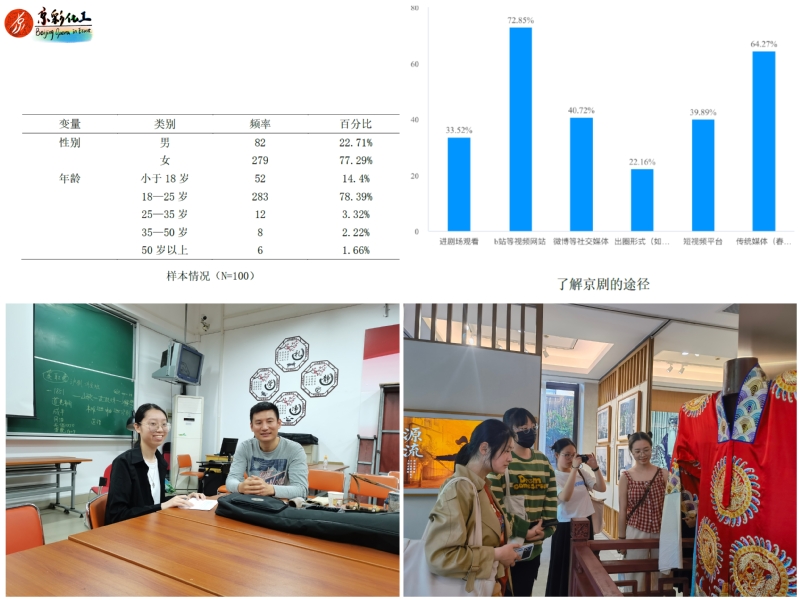 京剧是讲好中国故事的重要载体。信息化飞速发展的今天如何发展传统文化逐渐成为社会的热点话题。大创组于滢等同学通过问卷调研了大众(以大学生为主体)对京剧的认识和看法,收回有效问卷361份,撰写调研报告1篇,对京剧的发展及京剧进校园活动提供可行性建议。同时,团队对大学生票友和专业琴师进行了采访,实地参观考察了上海京剧传习馆,同学们为京剧在校园传承发展及服务社会贡献青春力量。