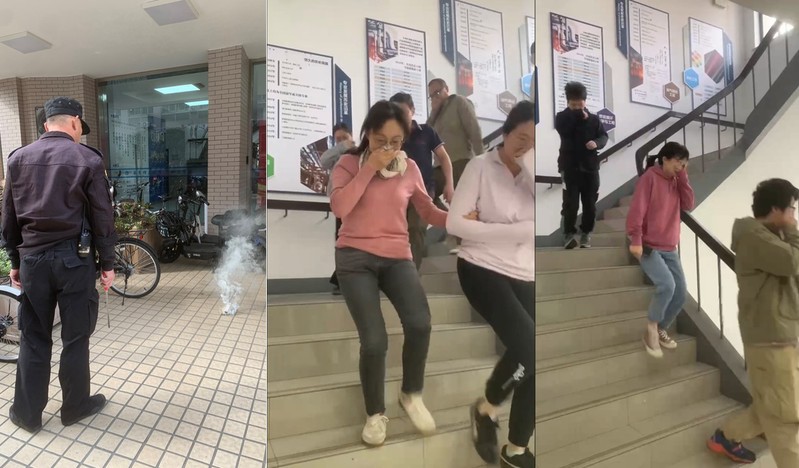 在演练正式开始之前,段凯洋对消防演练的具体流程、各楼层引导员的职责和注意事项进行了详细讲解,也为化工学院的师生普及了基础消防安全知识。下午两点,段凯洋宣布消防应急疏散演练正式开始,工作人员依照演习预案分别在实验12楼南侧和实验16楼南侧门口点燃烟饼,开始模拟火灾发生的场景,两栋实验楼也同时响起了消防报警铃声及语音提示。实验12楼及实验16楼的全体师生在34位楼层引导员的有序引导下,捂住口鼻,快速且有秩序地撤离到了安全区域。最后,段凯洋宣布2023化工学院消防应急疏散演练圆满结束。