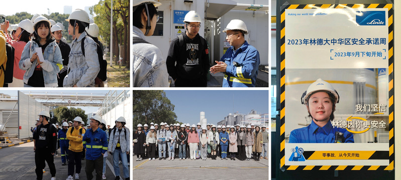 第一站,师生实地参观了林德气体工厂。第一次如此亲近空气分离装置,那些曾经在课本上的知识都“活”过来了,同学们踊跃提问,与工程师展开热烈的交流讨论。值得一提的是,工厂一行受到华理校友的热情接待。2021届华理校友胡碧涵毕业后入职林德,经过两年的成长,已经成为林德工厂的“安全管理”明星人物,厂区内随处可见她的海报。胡碧涵热情的向同学们介绍:“在母校学到的专业知识有效助力了我的职业成长,感谢母校的培养,使我得到知识和技能,实现了理想就业。”