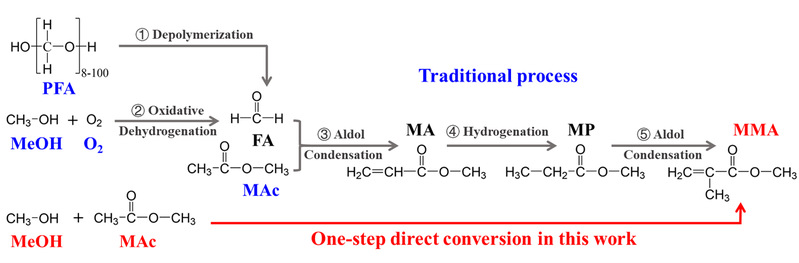 甲基丙烯酸甲酯(MMA)作为高端材料的基础原料,在光学镜片、电子信息、航空航天、光导纤维等领域具有广泛应用。截至2022年,我国MMA总生产能力已达到211.5万吨,同比增长38.24%,成为全球MMA产能最大的国家。值得指出的是,目前我国MMA的工业生产普遍存在污染大、流程复杂、核心技术受国外公司垄断等问题。在“双碳”战略目标下,开发绿色低碳环保、经济效益显著的MMA生产新工艺及其相关催化技术,将有助于推动我国MMA产业向高端发展。另一方面,甲醇是最基本的有机化工原料之一,具备碳资源和能源载体的双重属性。在CO2的大规模利用和绿氢的广泛应用中,甲醇扮演着独特的角色,成为低碳化工的化学品龙头。发展以甲醇为原料制造高端化学品的工艺路线符合我国的战略需求。