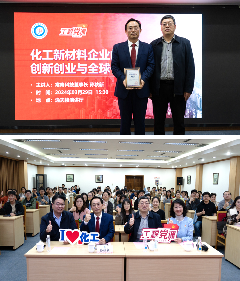 为深入学习贯彻习近平新时代中国特色社会主义思想,激发党员立足新时代、奋力新作为、创造新未来的热情,3月29日下午,1989届石油加工专业杰出校友、江苏常青树科技股份有限公司董事长孙秋新先生做客化工学院工程党课。化工学院党委书记朱学栋、石油加工所所长刘纪昌以及80余名师生党员共同参加本次活动。活动由化工学院党委副书记高艺霞主持。