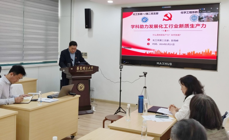 会议第二阶段的议程是发展新质生产力与课程思政理论学习,由我院化工系第二党支部书记彭阳峰进行领学。彭阳峰首先分享了他的“学科助力发展化工学科新质生产力”的学习体会,接着双方参会教师交流了自己对学科与发展化工行业新质生产力的学习感悟,得到了大家的积极响应。