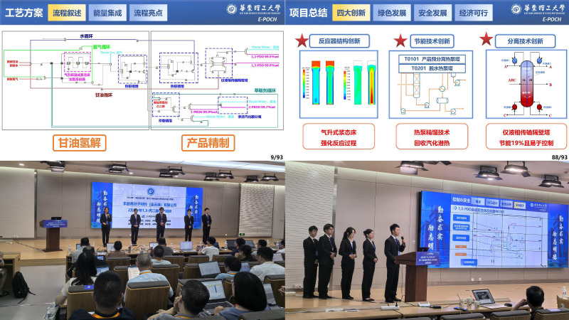 2024年的竞赛的内容是:为某大型化工企业设计一座1,3-丙二醇清洁生产的分厂,要求技术符合我国绿色低碳循环发展要求。我院“E-POCH”队以某油脂厂副产甘油为原料,采用甘油氢解法设计了年产2万吨1,3-丙二醇项目。历经7个月,团队成员从项目可行性研究、工艺方案比选论证、流程搭建、设备设计及选型、自动控制、总图布置、车间布置、安全评价、经济分析等多个方面,对项目进行精心设计,具有高效生产、绿色环保、节能减排、安全可靠、经济可行的特点,符合中国制造2025的要求。“E-POCH”队的5位指导老师为沈荣春、黄子宾、吴艳阳、雷明、彭阳峰,另有袁佩青、李瑞江、魏永明、杨座国、杨敬一、宗原6位老师深度参与了竞赛指导。
