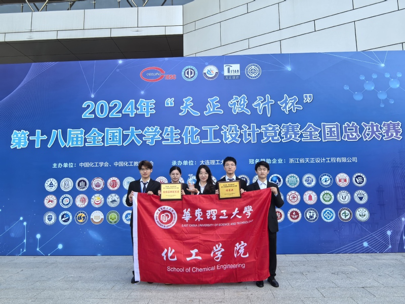8月22日,由中国化工学会、中国化工教育协会主办,大连理工大学承办,浙江省天正设计工程有限公司冠名赞助的2024年第十八届全国大学生化工设计竞赛全国总决赛在辽宁大连胜利落幕。从国内赛道七大赛区450所高校的3685支队伍(参赛人数近2万)中脱颖而出的60支参赛队伍和从国际赛道胜出的1支参赛队伍,在设计文档质量、工程图纸绘制、现代设计方法应用和现场答辩等4个环节中进行激烈角逐。由我院2021级学生王陈怡、黄嘉艳、吴良宇、吉洋、钟林康组成的“华东理工大学E-POCH”队荣获全国特等奖和现场答辩优秀奖。